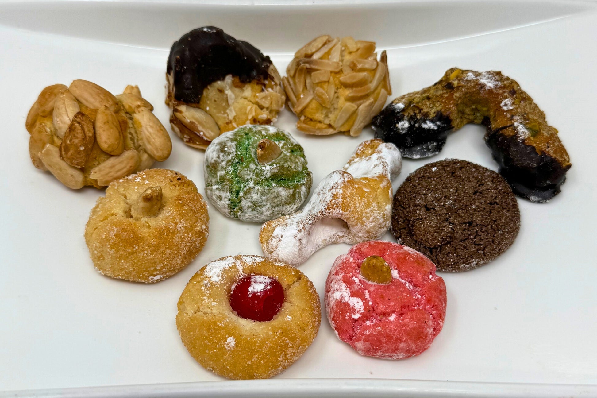 Almond paste cookies, made without flour, offering a nutty delight in a convenient pre-packaged form. Assortment may vary.