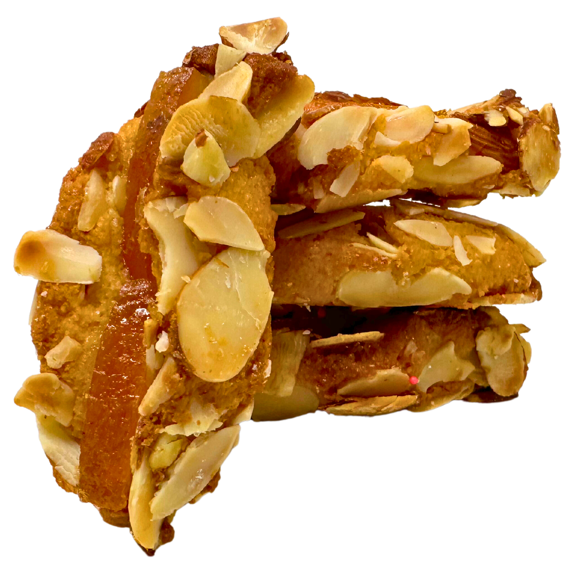 Crisp almond paste cookies with a delightful blend of candied orange and toasted sliced almonds, perfect for a sweet treat.