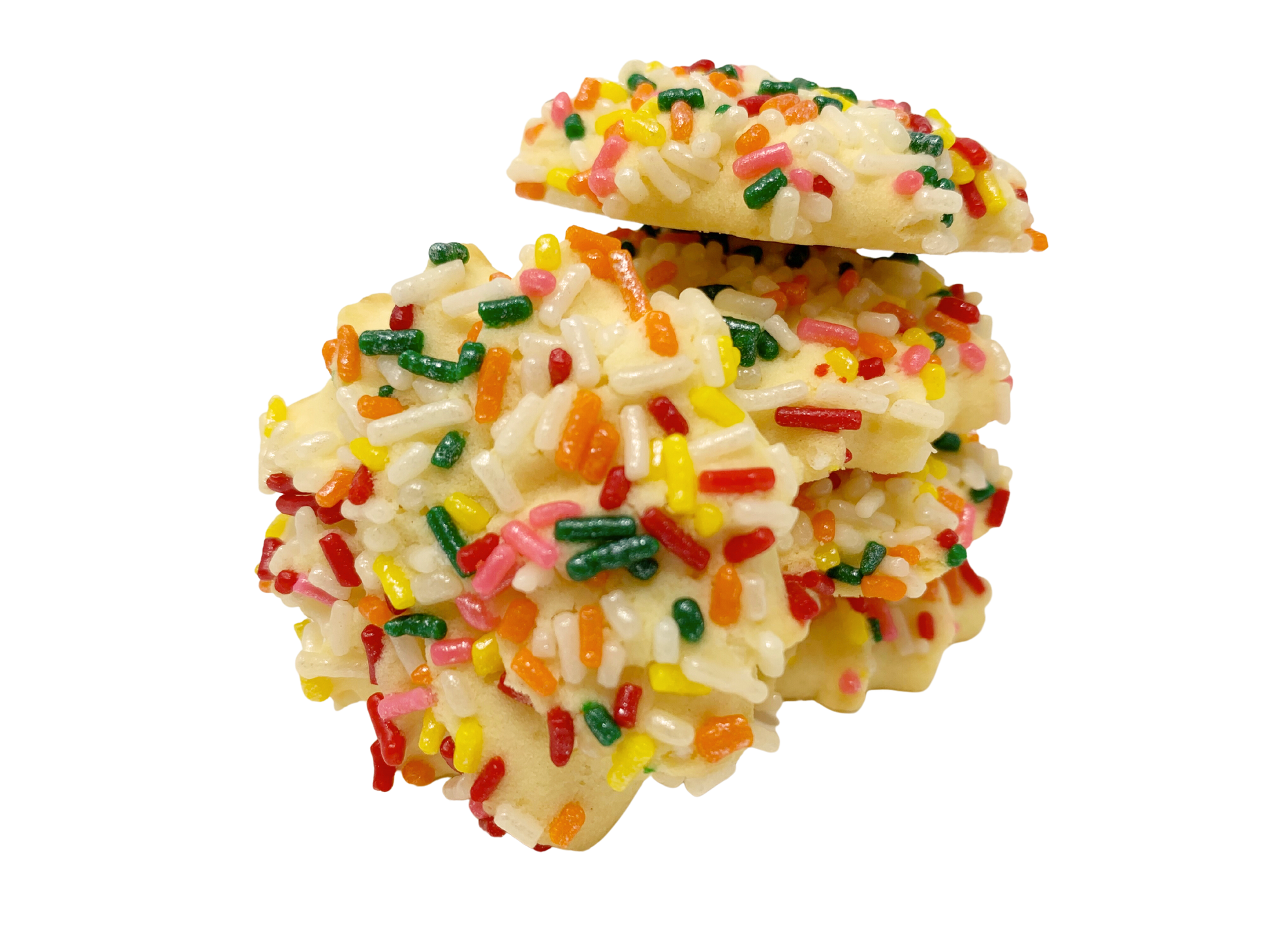 Buttery cookies adorned with vibrant rainbow sprinkles for a delightful, colorful treat.
